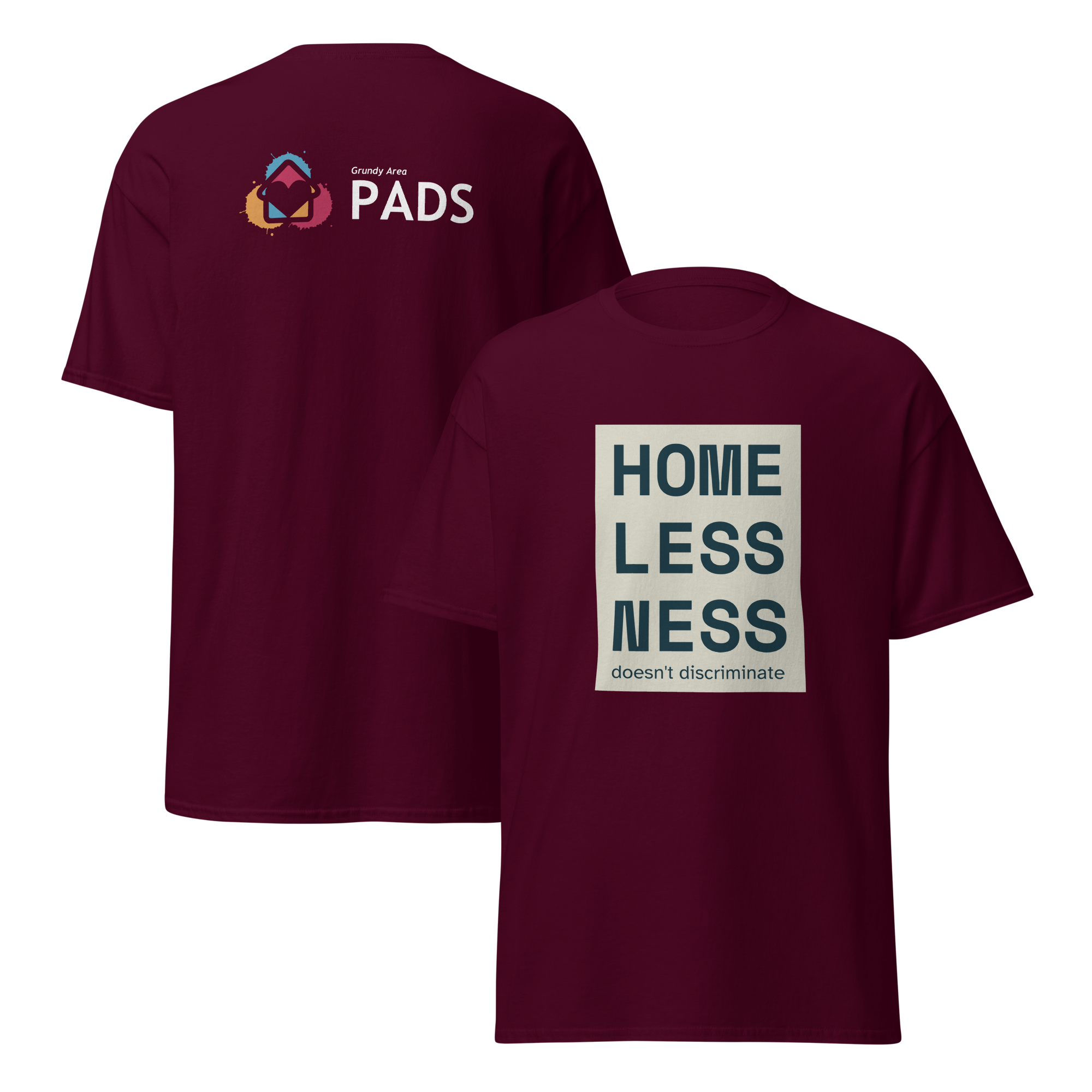 Make a bold statement and show your support with our Limited Edition Tee. Featuring the impactful phrase “Homelessness Doesn’t Discriminate” on the back and the Grundy Area PADS logo on the front, this shirt isn’t just apparel—it’s advocacy. Built with durable cotton and a structured fit, it’s perfect for everyday wear while raising awareness wherever you go.